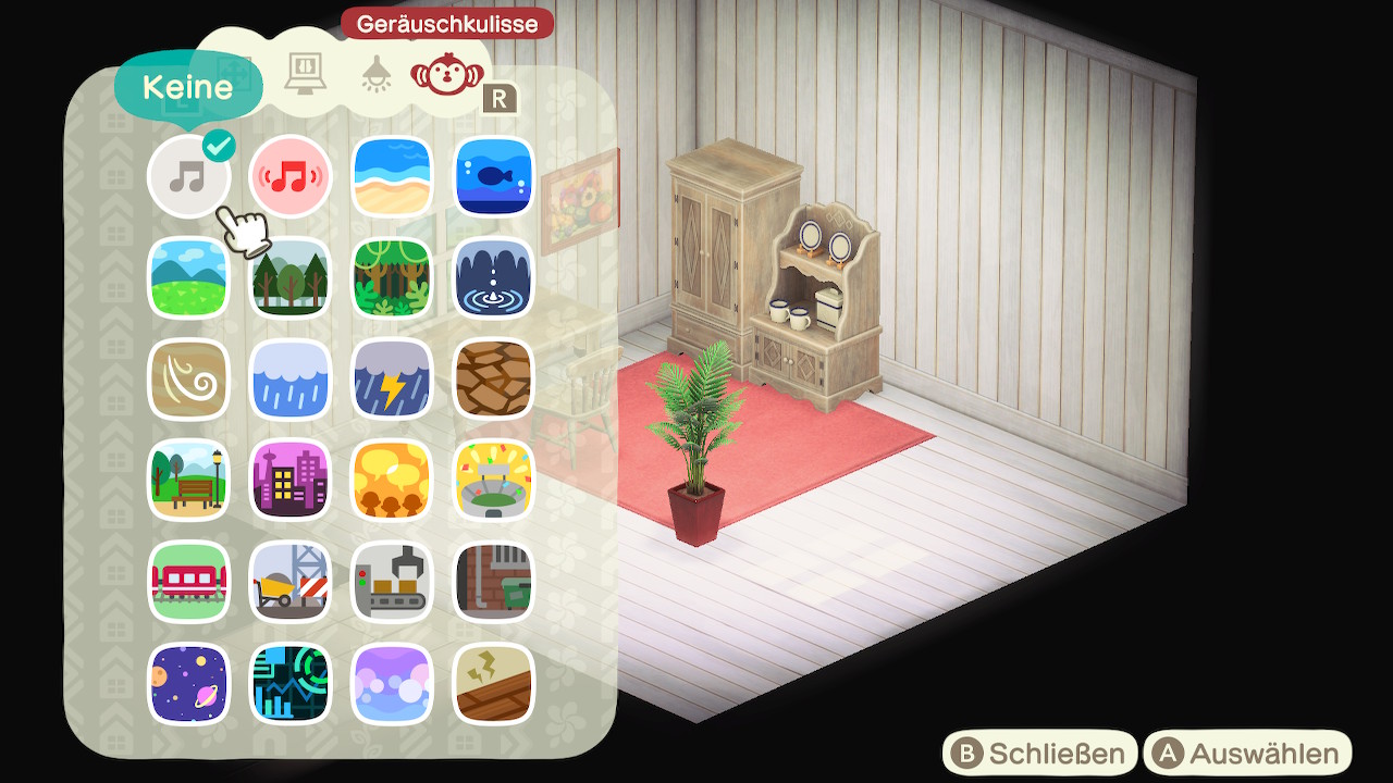 Raumeinstellungen kannst du im Einrichtungsmodus mit dem Links-Richtungsknopf öffnen. Den Einrichtungsmodus kannst du mit dem Abwärts-Richtungsknopf öffnen.