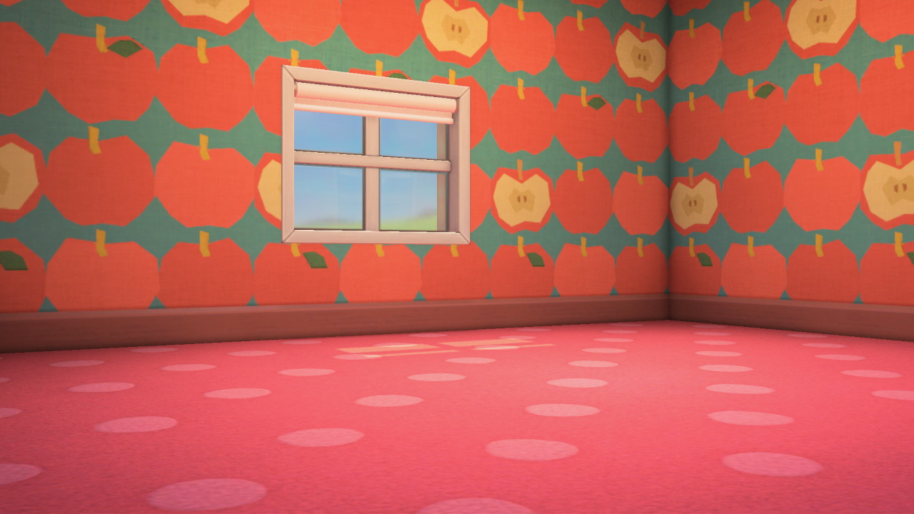 Das Motiv „Früchte-Zimmer“ kann nur für VIP-Zimmer im Hotel verwendet werden. Zu Beginn ist das Zimmer mit der Apfeltapete und dem Rot-Punktboden eingerichtet und das warmweiße Licht ist eingeschaltet. Stellst du ein Musikabspielgerät auf, ist „K.K. Synthi“ vorausgewählt.