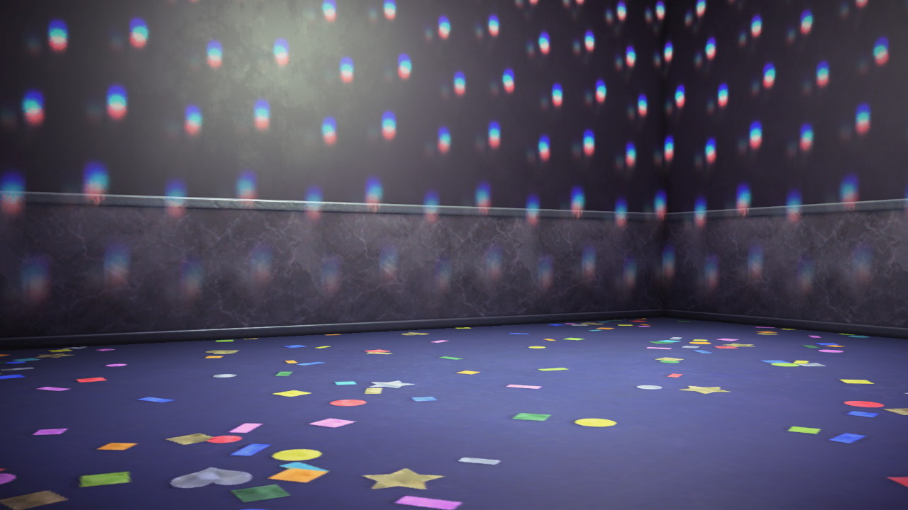 Das Motiv „Spiele-Zimmer“ kann nur für VIP-Zimmer im Hotel verwendet werden. Zu Beginn ist das Zimmer mit der Discotapete und dem Partyboden eingerichtet und das kaltweiße Licht ist eingeschaltet. Stellst du ein Musikabspielgerät auf, ist „DJ K.K.“ vorausgewählt.