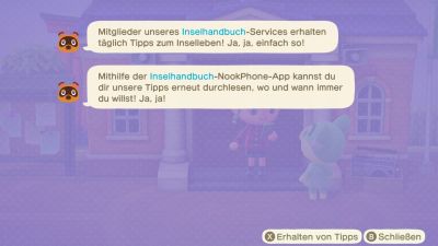 Drückst du in der Inselhandbuch-App den X-Knopf („Erhalten von Tipps“), kannst du entscheiden, ob du weiterhin Tipps bekommen möchtest.
